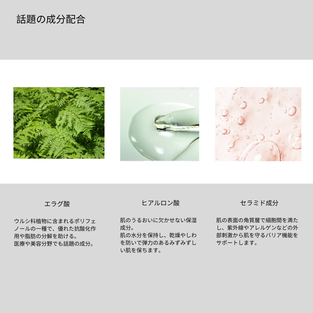 ・セラミド成分:肌の表面の角質層で細胞間を満たし、紫外線やアレルゲンなどの外部刺激から肌を守るバリア機能をサポートします。